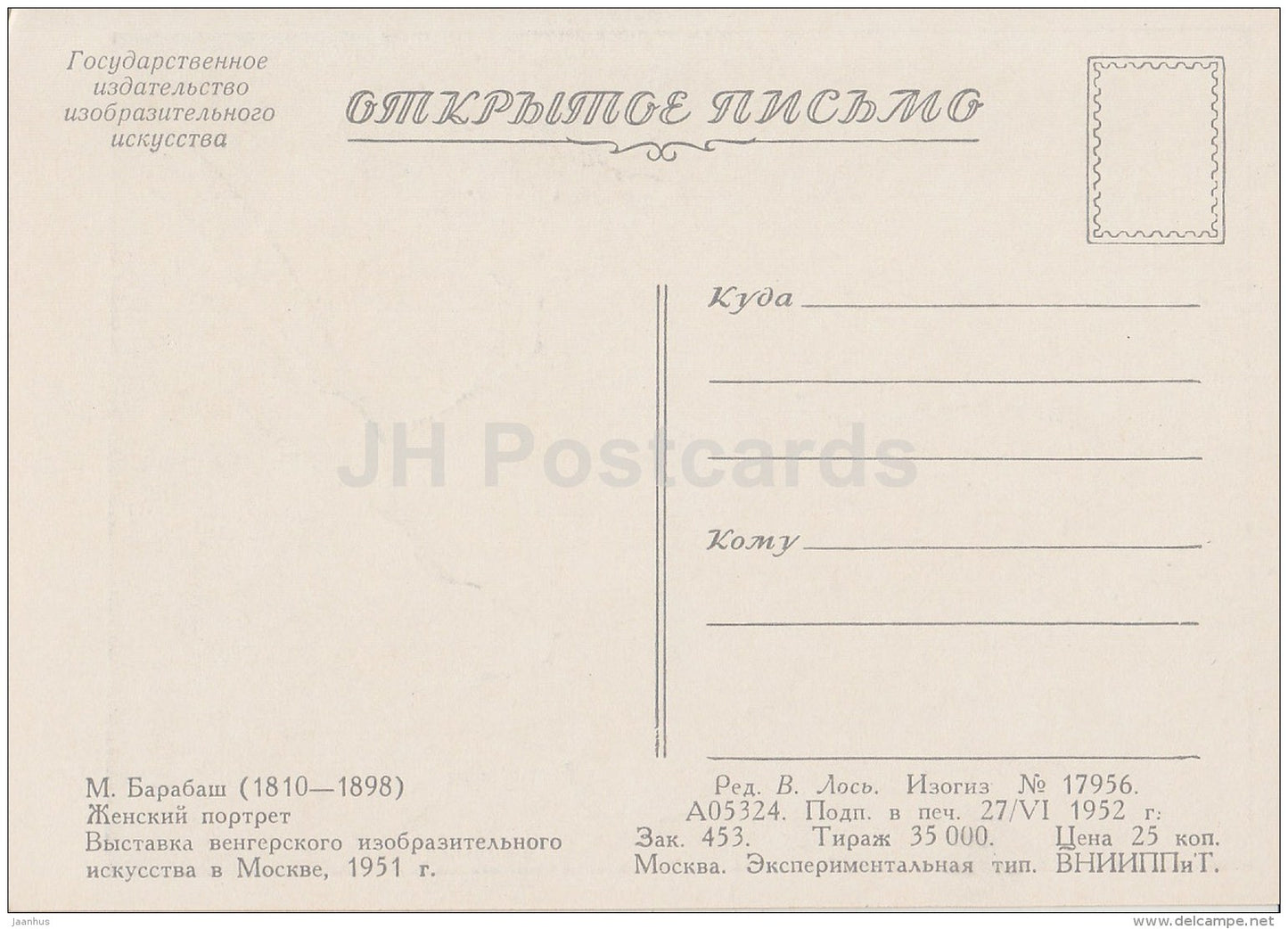 Painting by M. Barabas - Portrait of a Woman - Hungarian art - 1952 - Russia USSR - unused
