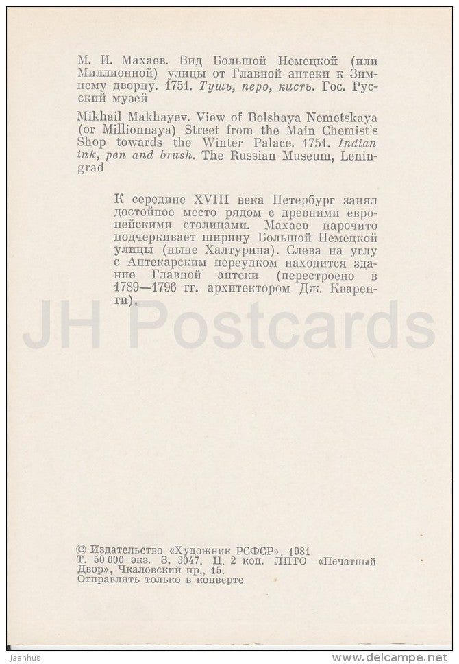 painting by M. Makhayev - View of Bolshaya Nemetskaya Street , 1751 - russian art - Russia USSR - 1981 - unused
