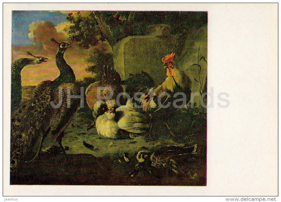 painting by Melchior d'Hondecoeter - Poultry - birds - cock - peacock - Dutch art - 1983 - Russia USSR - unused
