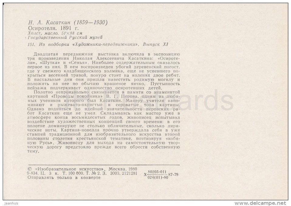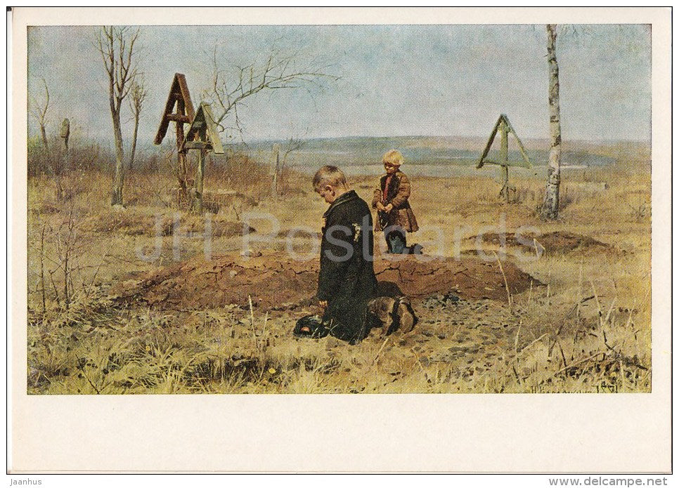 painting by N. Kasatkin - Orphaned Children , 1891 - graveyard - Russian art - 1980 - Russia USSR - unused