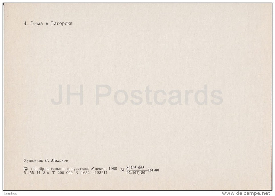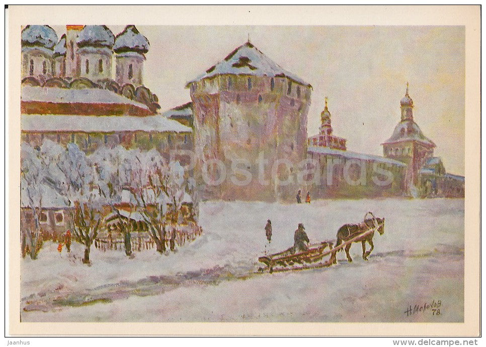 painting by N. Malakhov - Winter in Zagorsk - horse sledge - Russian art - Russia USSR - 1980 - unused