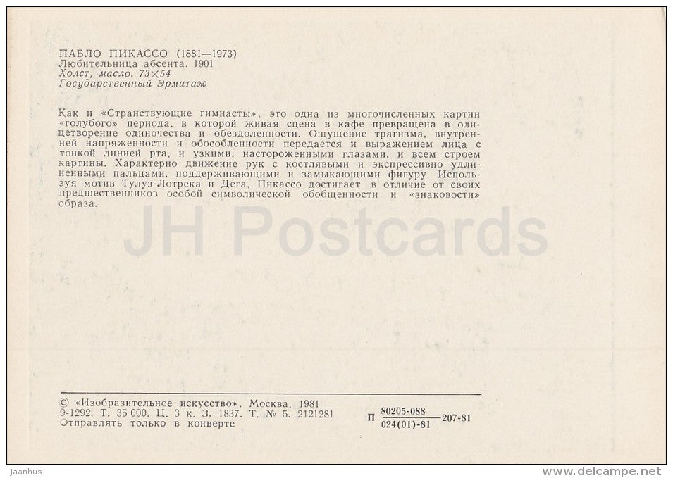 painting by P. Picasso - Absinthe lover , 1901 - Spanish art - 1981 - Russia USSR - unused