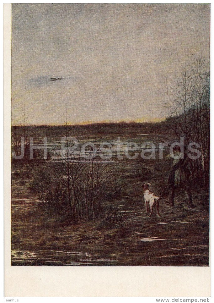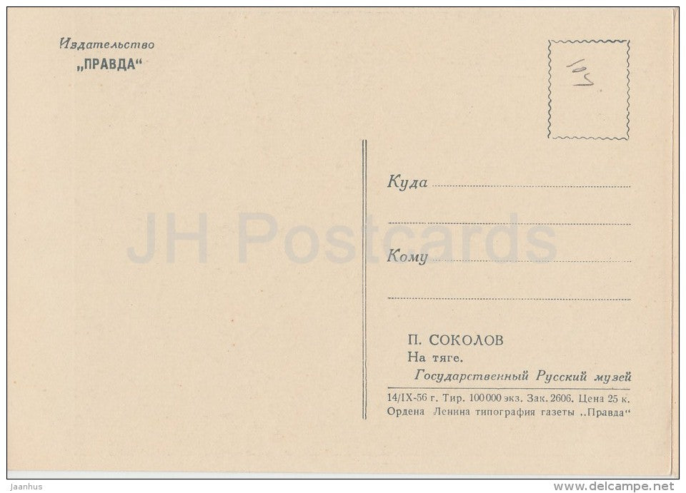 painting by P. Sokolov - On draft - hunting dog - hunter - Russian art - 1956 - Russia USSR - unused