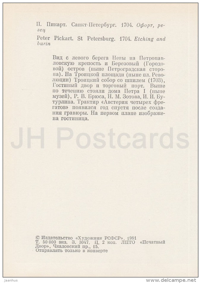 painting by Peter Pickart - St. Petersburg , 1704 - sailing boat - art - Russia USSR - 1981 - unused