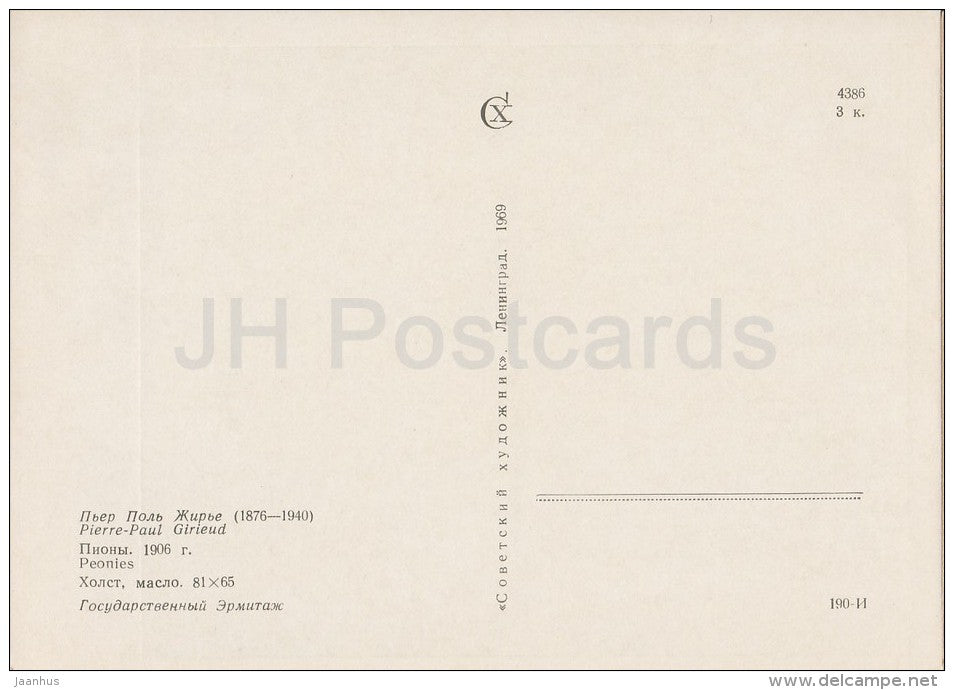 painting by Pierre-Paul Girieud - Peonies , 1906 - flowers - Flemish art - 1969 - Russia USSR - unused