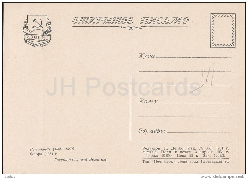 painting by Rembrandt - Flora , 1634 - woman - Dutch art - 1954 - Russia USSR - unused
