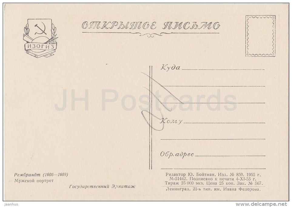 painting by Rembrandt - Portrait of a Man - man - Dutch art - 1955 - Russia USSR - unused