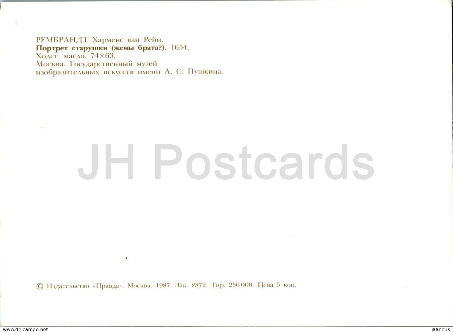 painting by Rembrandt - Portrait of Old Woman - Dutch art - 1987 - Russia USSR - unused