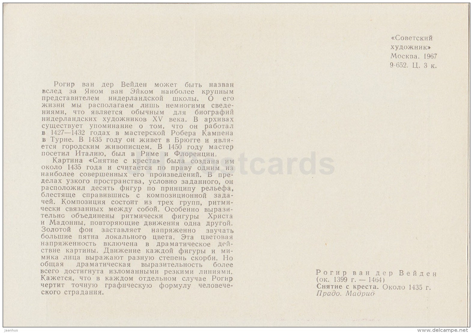 painting by Rogier van der Weyden - Removal from the Cross , 1435 - Jesus - Dutch art - 1967 - Russia USSR - unused
