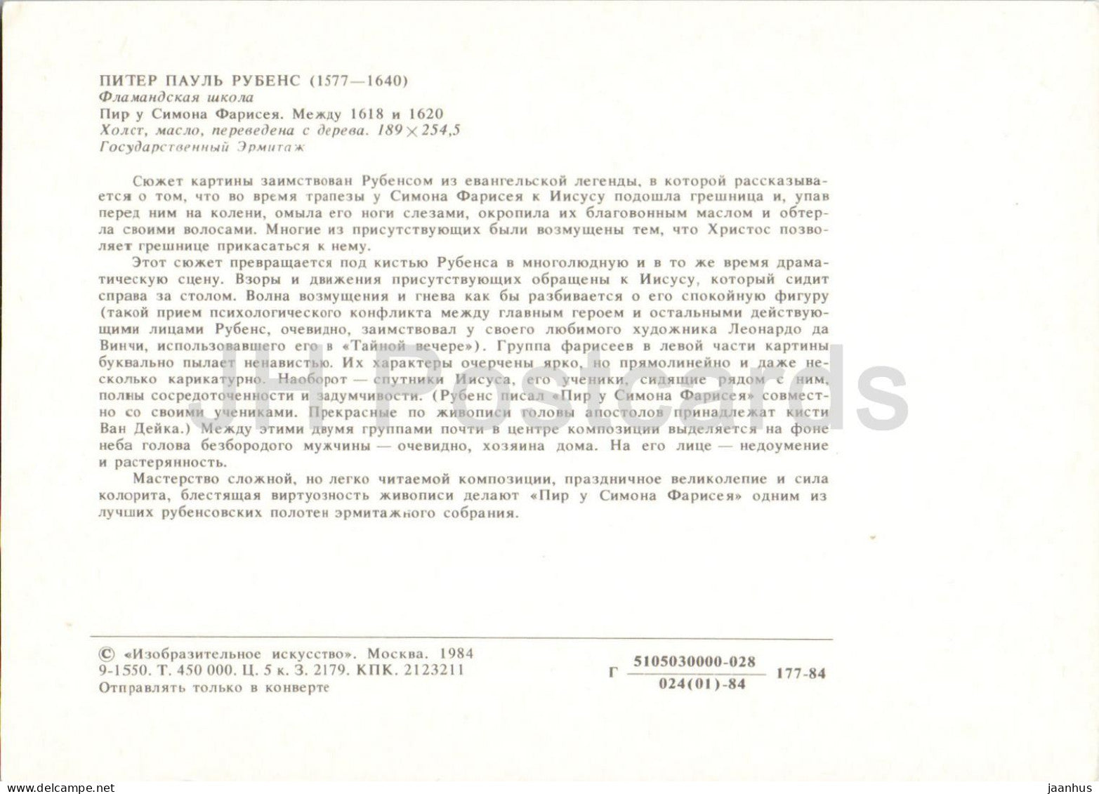 painting by Rubens - The Feast in the House of Simon the Pharisee - Flemish Art - 1984 - Russia USSR - unused