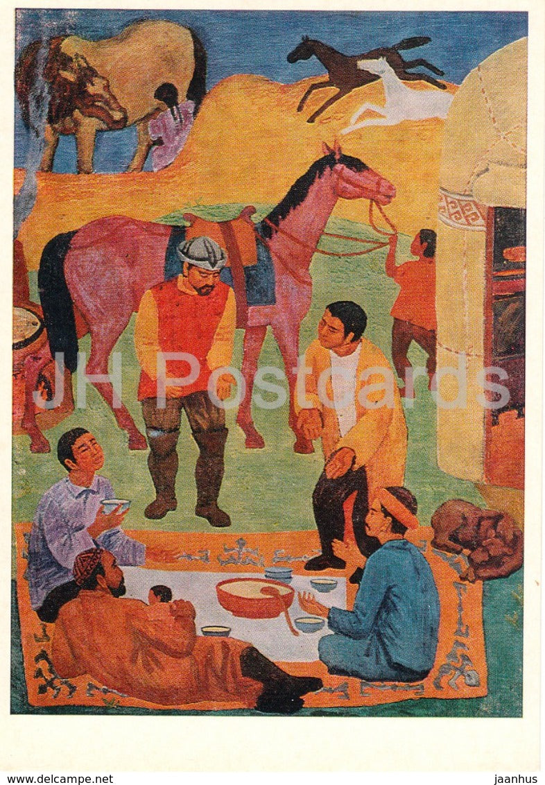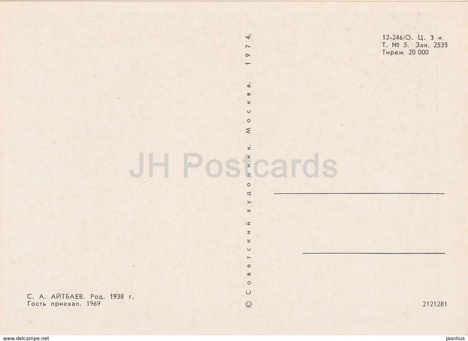 painting by S. Aytbaev - Guest arrived - horse - Kazakhstan art - 1974 - Russia USSR - unused
