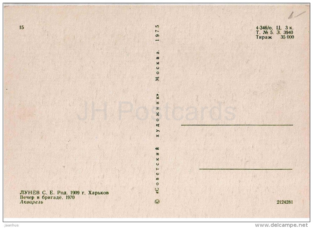 painting by S. Lunev - Evening in the brigade , 1970 - village - russian art - unused