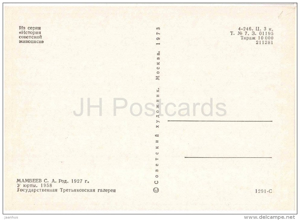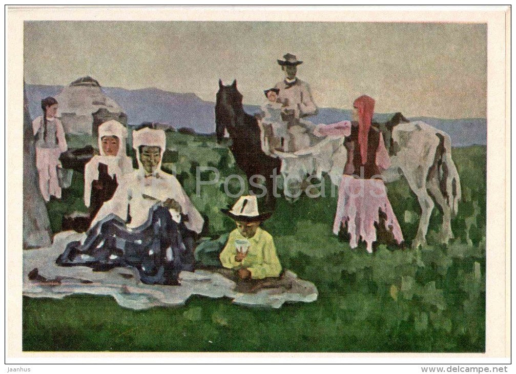 painting by Sabur Mambeyev - Near yurt - horses - famiy - kazakhstan art - unused