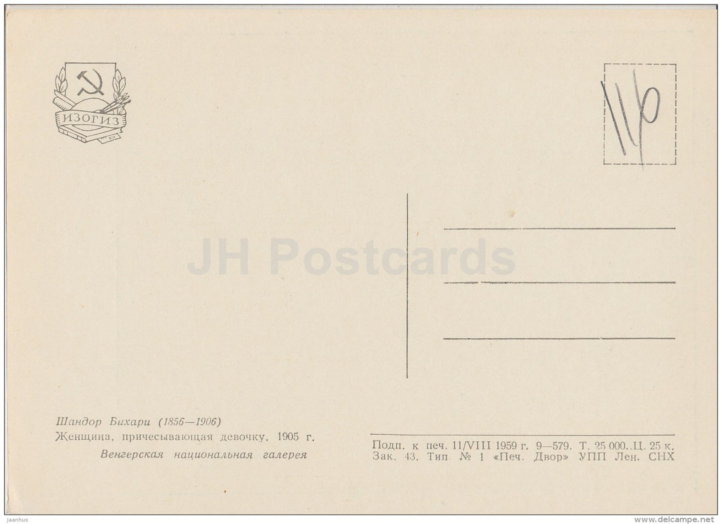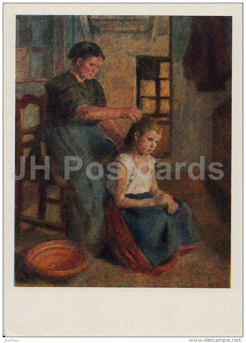 Painting by Sandor Bihari - Woman combs girl´s hair , 1905 - Hungarian art - 1959 - Russia USSR - unused