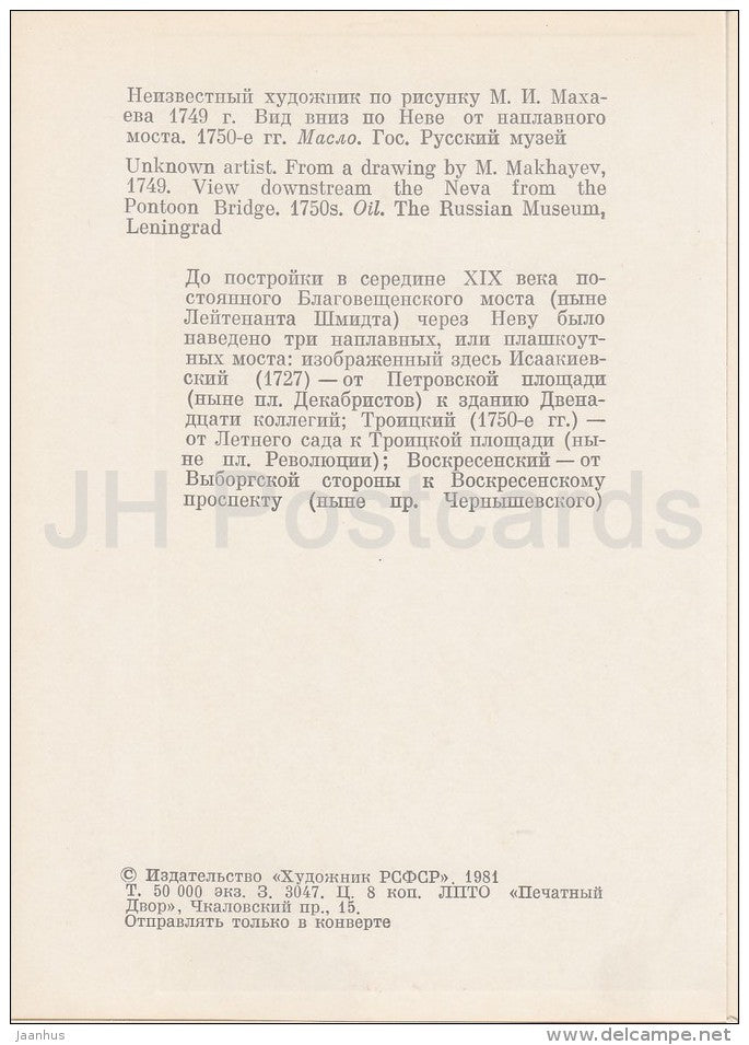 painting by Unknown Artist - Neva from the Pontoon Bridge , 1750s - boat - Russian art - Russia USSR - 1981 - unused