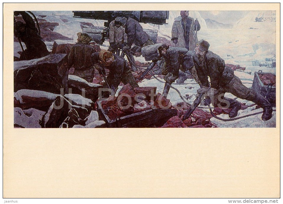 painting by V. Chekaniuk - Morning of Siberia , 1963 - workers - Ukrainian art - 1977 - Russia USSR - unused