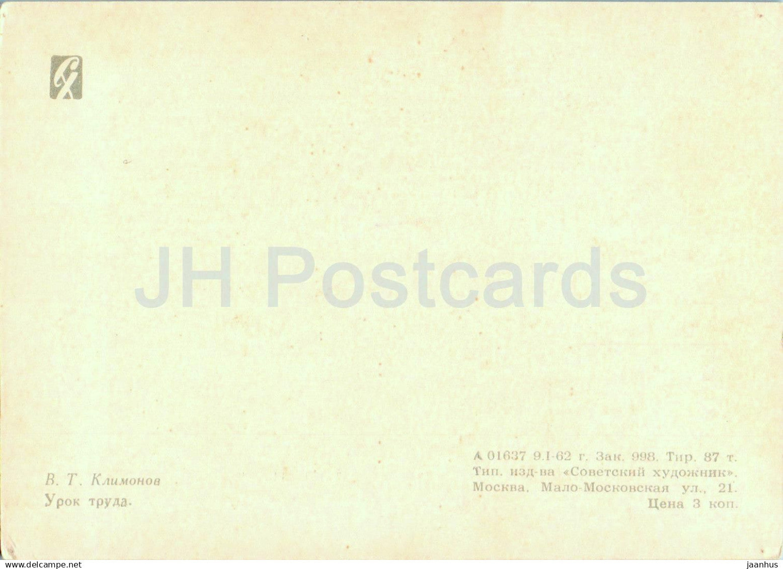 painting by V. Klimonov - Job training lesson - teacher - boy - man - pioneer Russian art - 1962 - Russia USSR - unused
