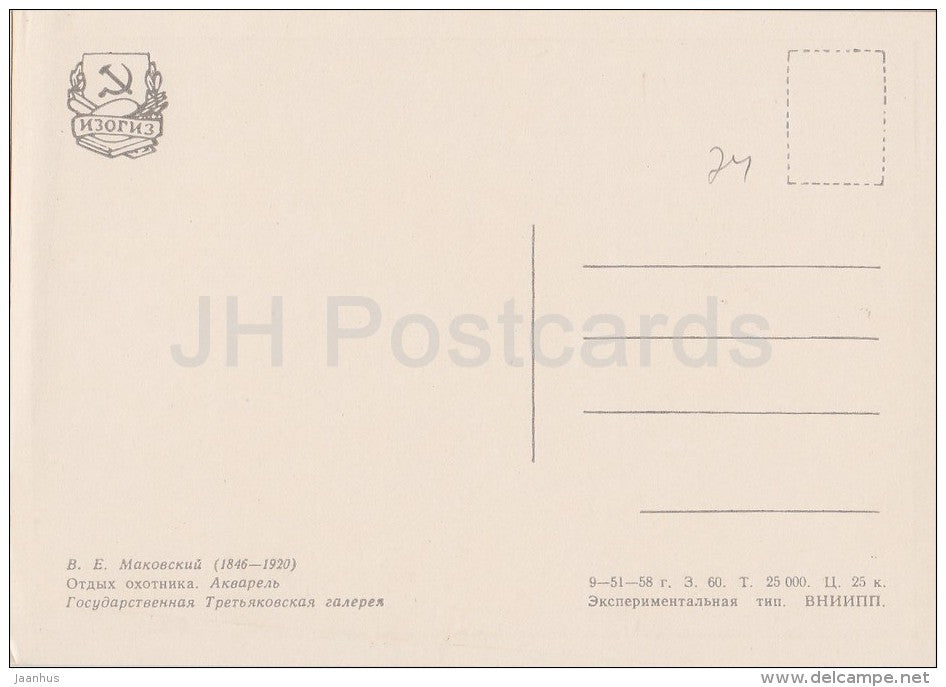 painting by V. Makovsky - Hunter's rest - hunting dog - Russian art - 1958 - Russia USSR - unused