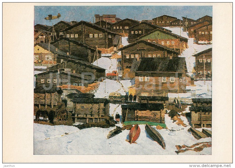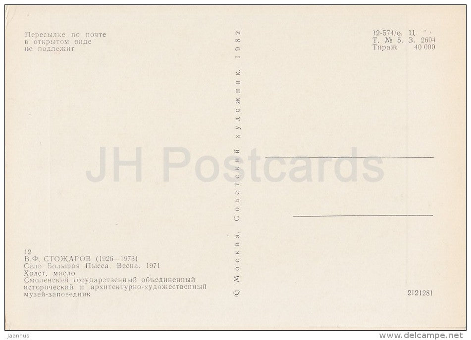 painting by V. Stozharov - Bolshaya Pyssa village . Spring , 1971 - boats - Russian art - 1982 - Russia USSR - unused