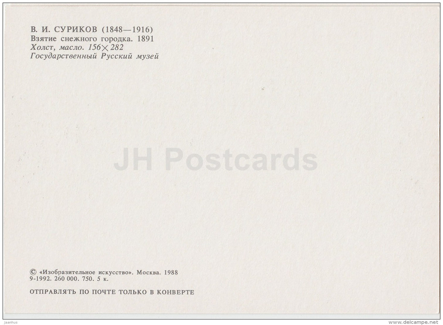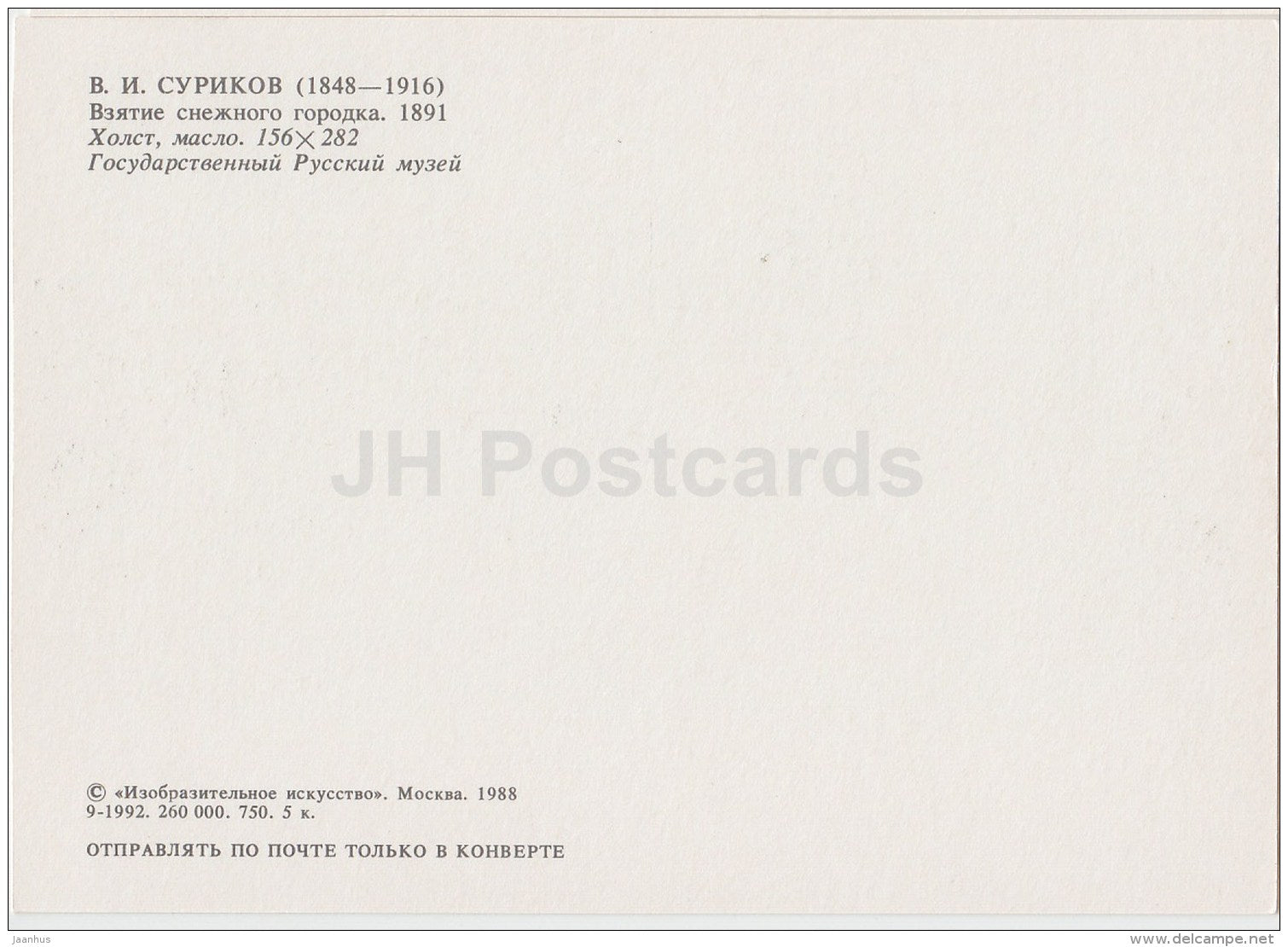 painting by V. Surikov - Battle for a snow town , 1891 - children playing - Russian art - 1988 - Russia USSR - unused