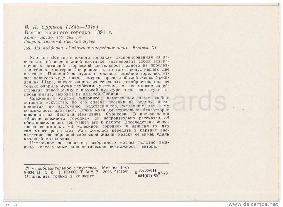 painting by V. Surikov - Taking a snow town , 1891 - horse sledge - Russian art - 1980 - Russia USSR - unused
