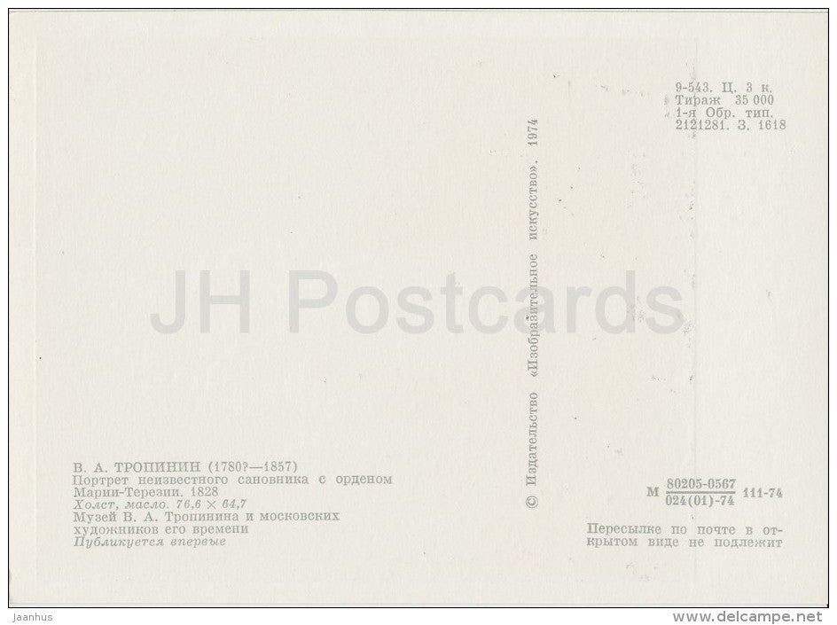 painting by V. Tropinin - Portrait of an unknown nobleman , 1828 - Russian art - 1974 - Russia USSR - unused