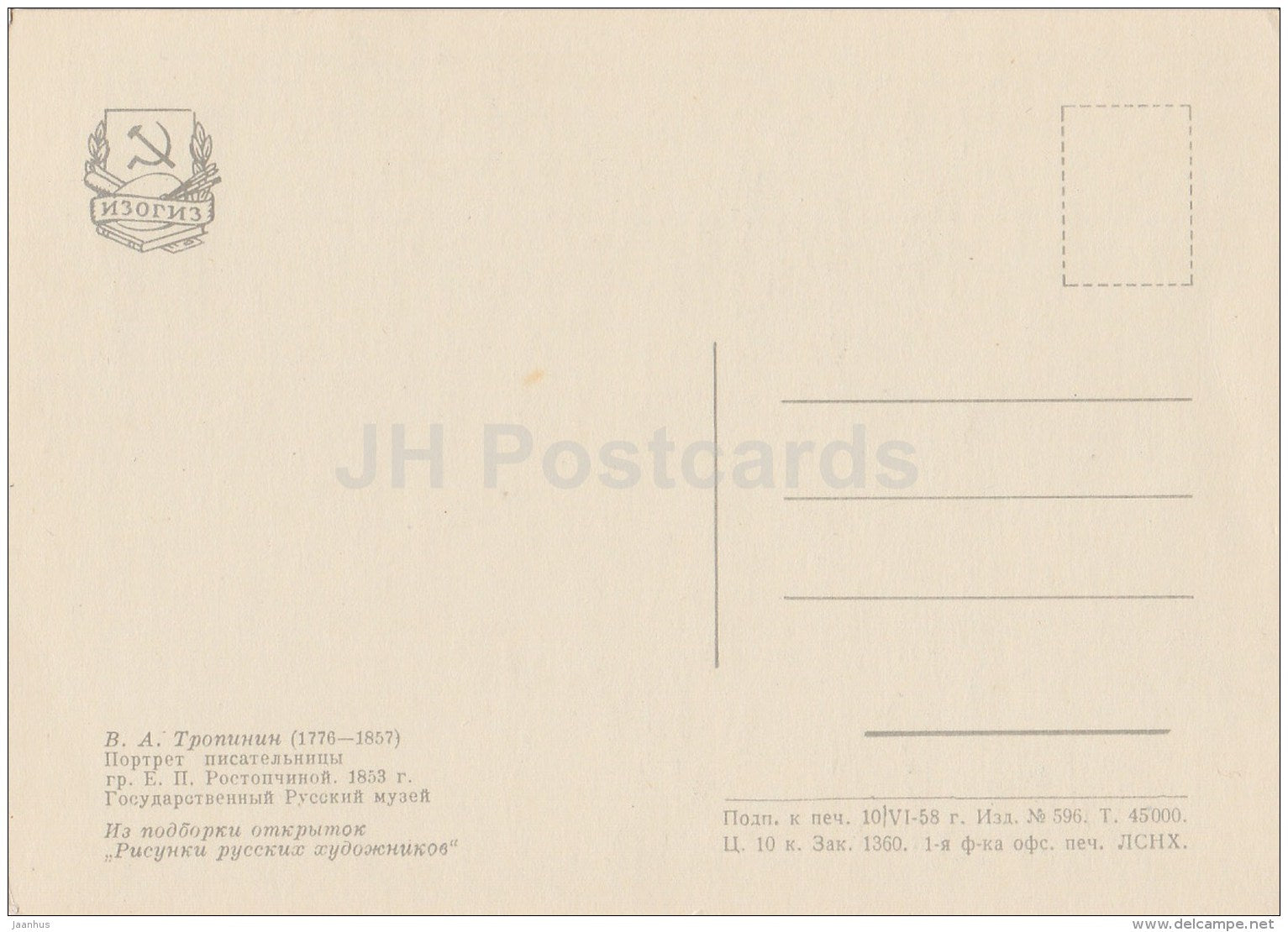 painting by V. Tropinin - Portrait of Writer E. Rostopchina , 1853 - Russian art - 1958 - Russia USSR - unused