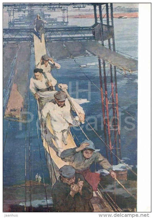 painting by Y. Bosko - Weekday in Stalingrad hydroelectric station , 1959-1960 - workers - russian art - unused
