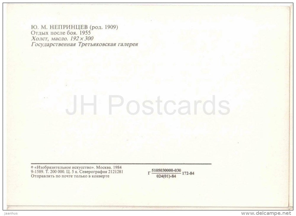 painting by Y. Neprintsev - Rest after Battle , 1955 - russian soldiers - soviet art - russian art - unused