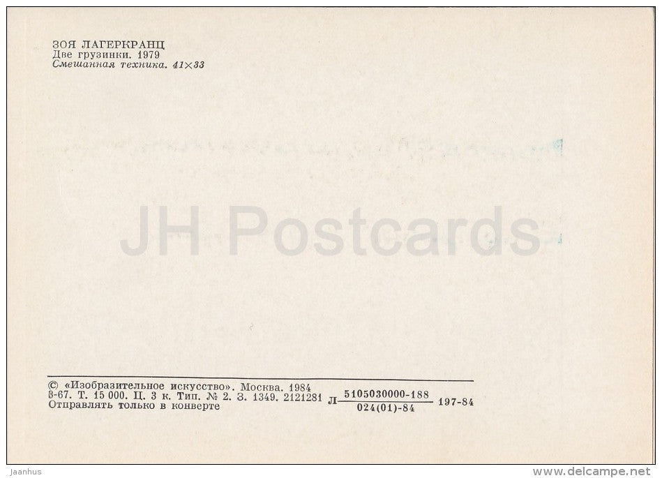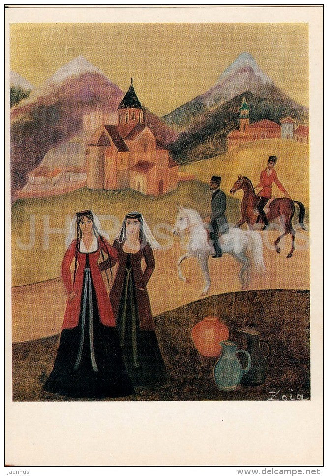 painting by Z. Lagerkrantz - Georgian Women , 1979 - horse - church - riders - Russian art - 1984 - Russia USSR - unused