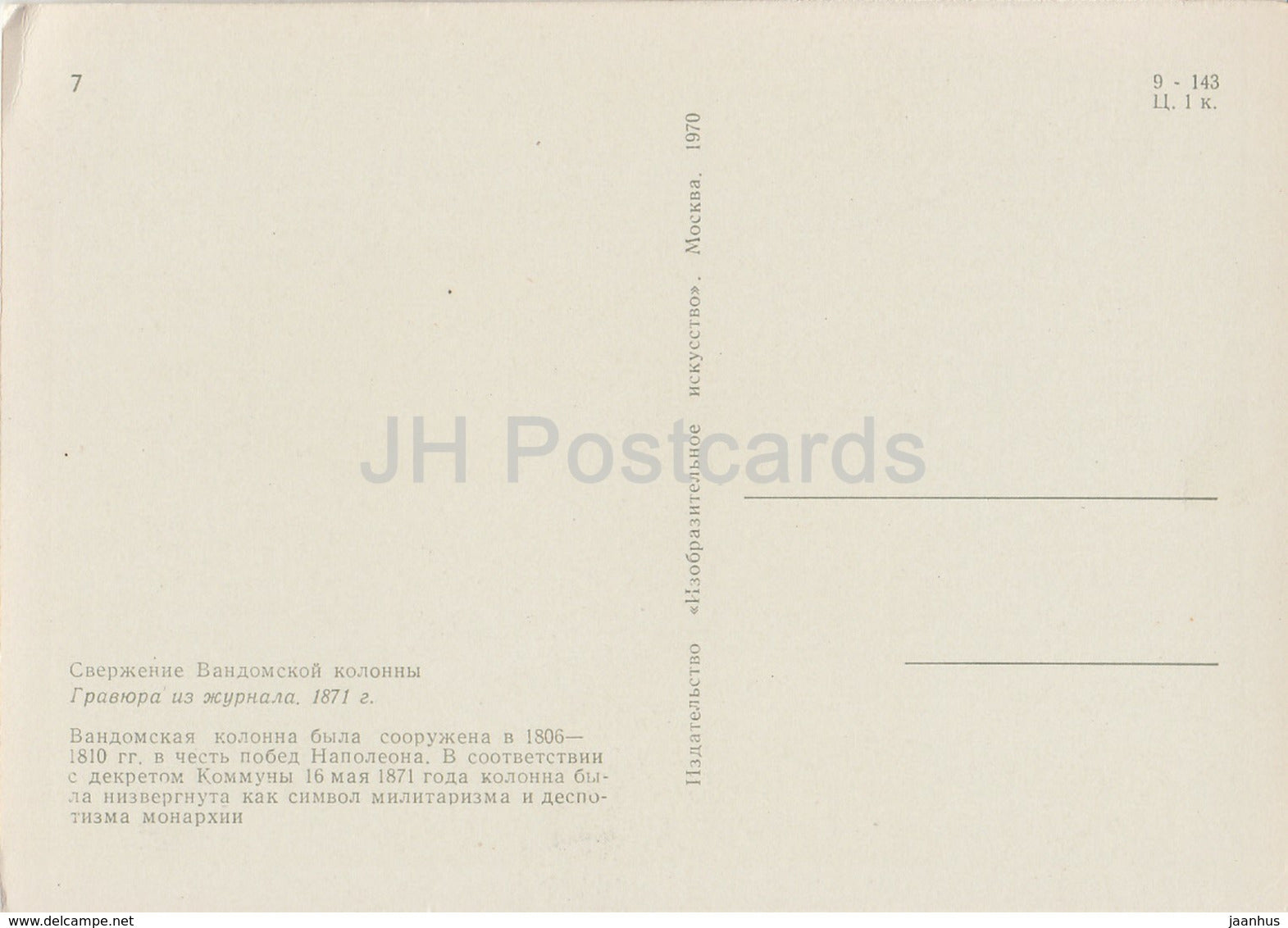 Paris - overthrow of the Vendome column - illustration - 1970 - Russia USSR - unused