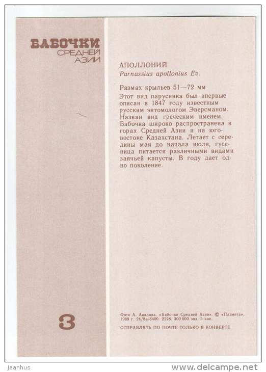 Parnassius apollonius - butterfly - Central Asia butterflies - 1989 - Russia USSR - unused