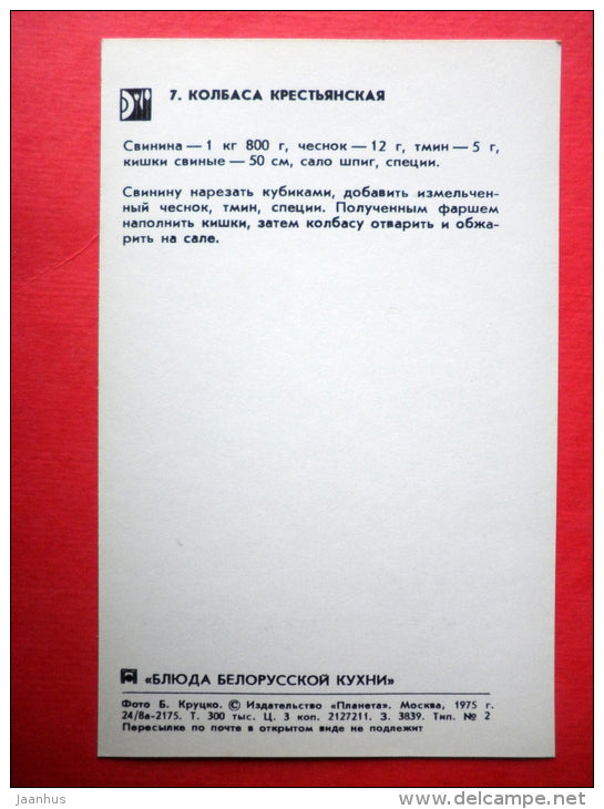 peasant sausage - recipes - Belarusian dishes - 1975 - Russia USSR - unused