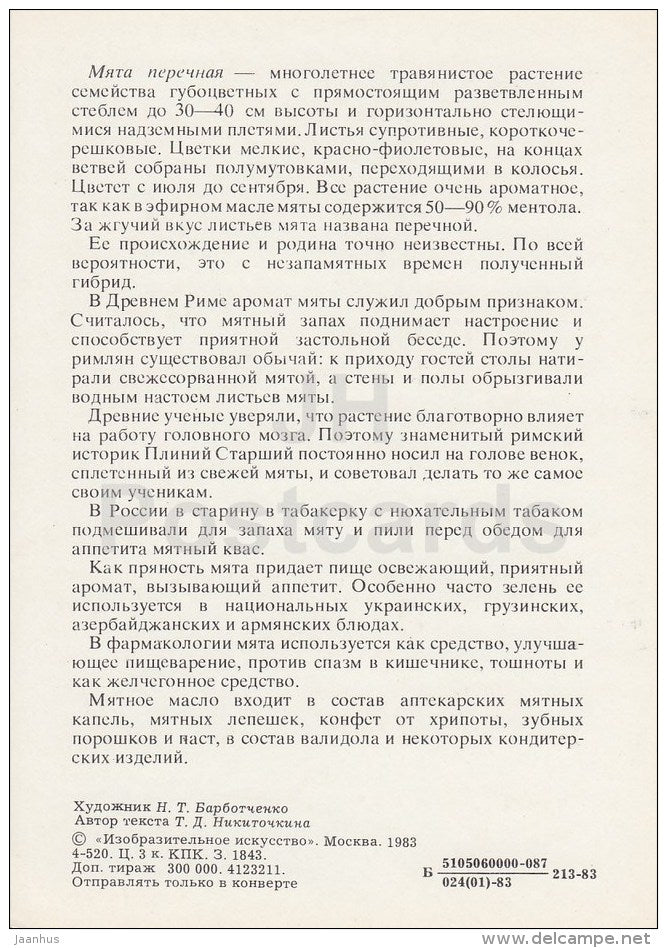 Peppermint - Spice Plants - 1983 - Russia USSR - unused