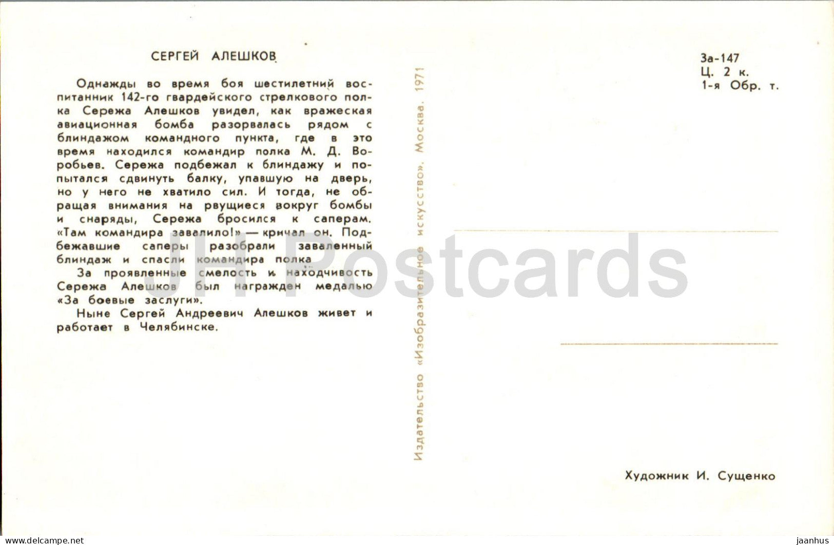 Pioneers Heroes - Sergey Aleshkov - boy - illustration by I. Suschenko - 1971 - Russia USSR - unused