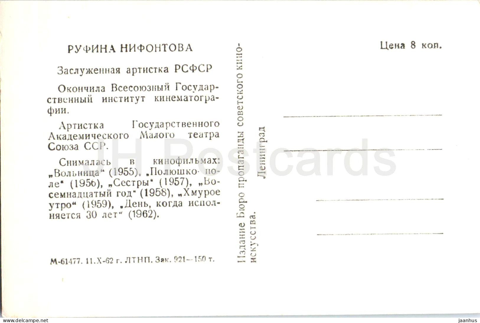 Rufina Nifontova - Soviet - Russian movie actress - 1 - 1962 - Russia USSR - unused
