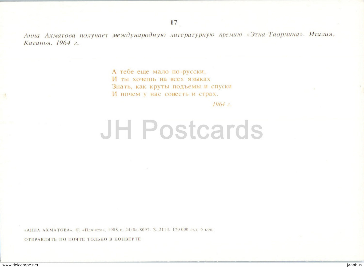 Russian poet Anna Akhmatova - receiving international literary award Etna Taormina 1964 - 1988 - Russia USSR - unused