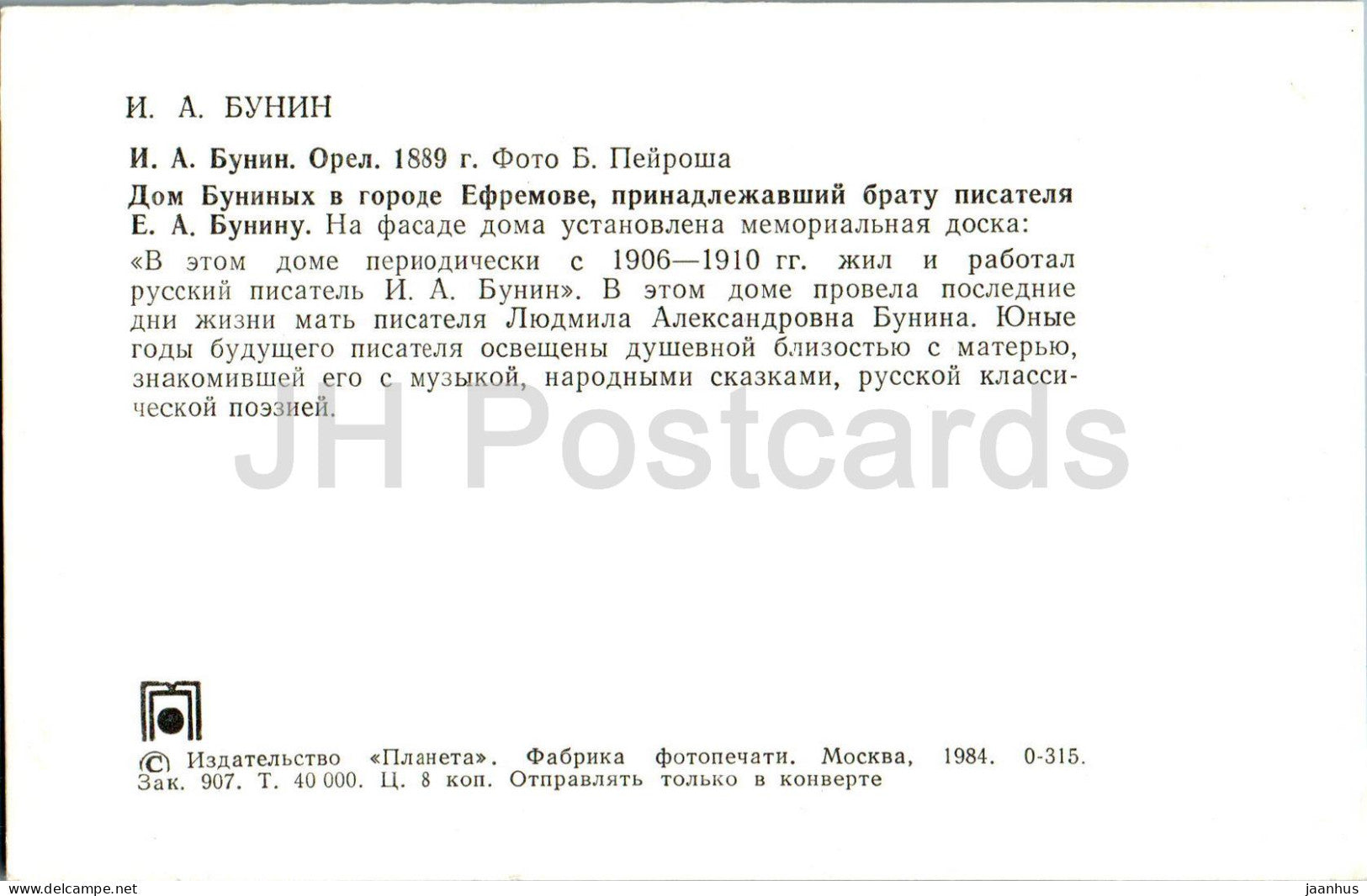 Russian writer Ivan Bunin - Bunin in Oryol 1889 - Bunin Family House in Yefremov - 1984 - Russia USSR - unused