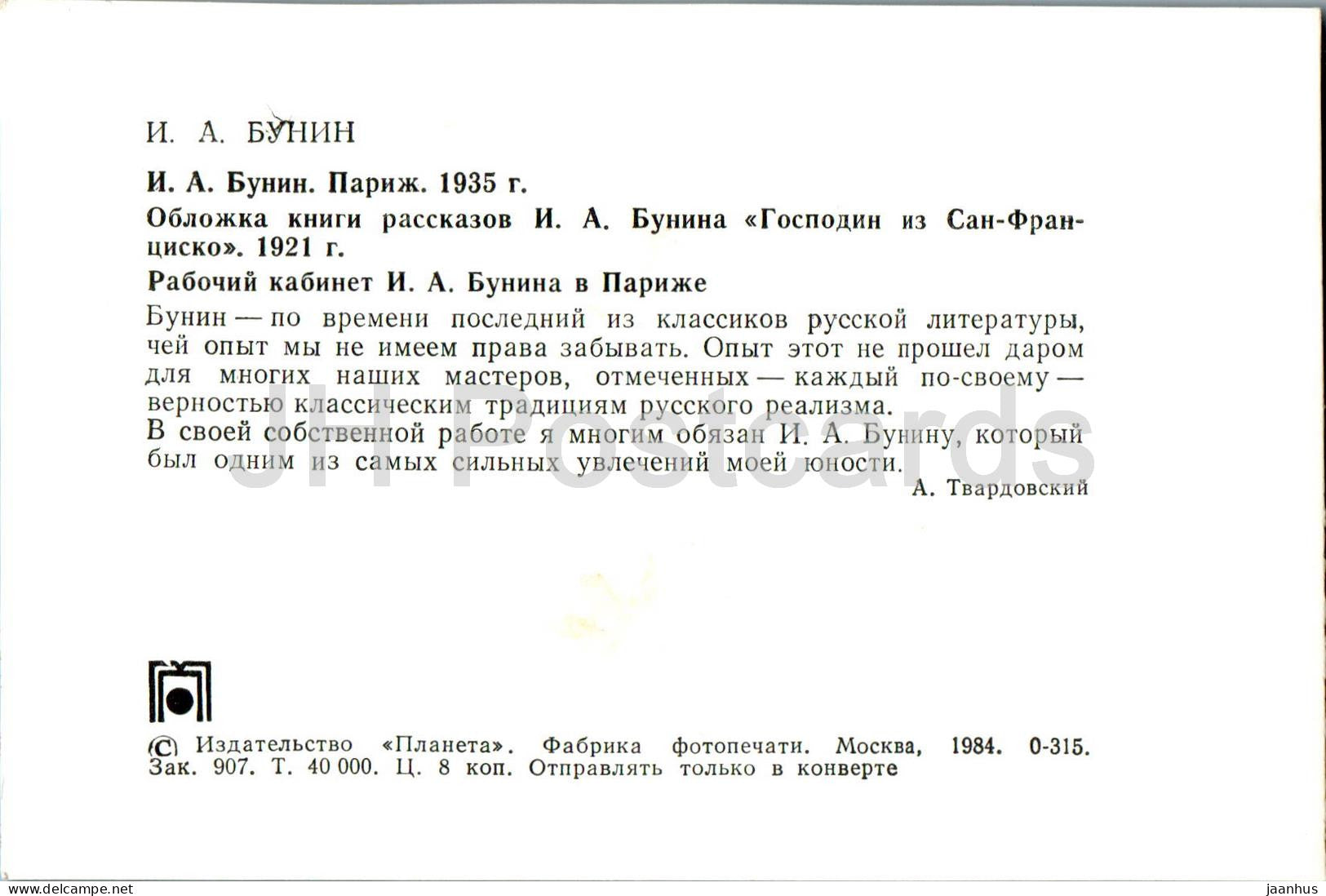 Russian writer Ivan Bunin - Bunin in Paris 1935 - Study in Paris - 1984 - Russia USSR - unused