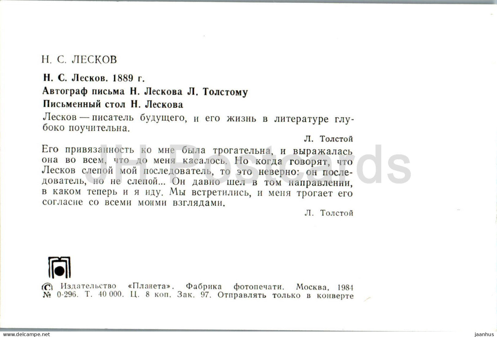 Russian writer Nikolai Leskov - in 1889 - autograph of Leskov's letter to Tolstoy - desk - 1984 - Russia USSR - unused