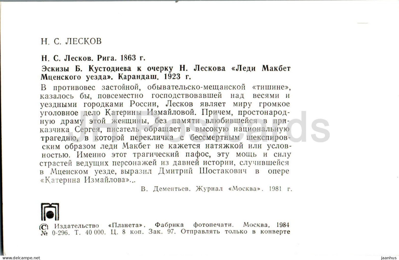 Russian writer Nikolai Leskov - In Riga 1863 - Kustodiev sketches to Lady Macbeth - 1984 - Russia USSR - unused