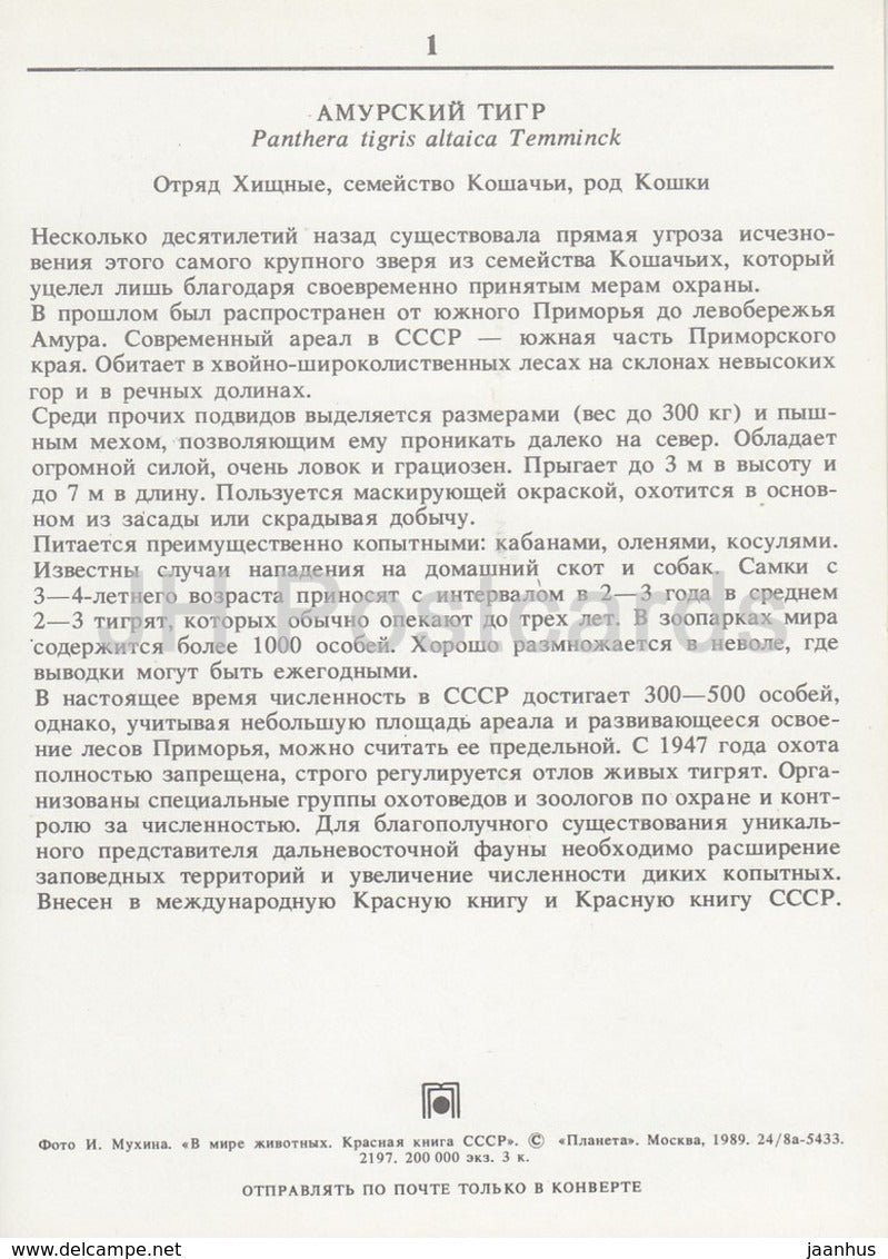 Siberian Tiger - Panthera tigris altaica - animals - 1989 - Russia USSR - unused