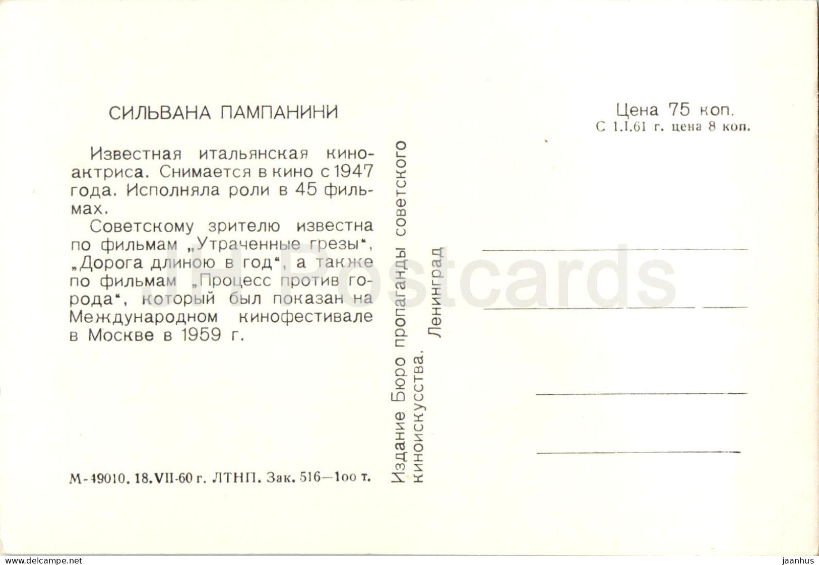 Silvana Pampanini - Italian movie actress - 1 - 1960 - Russia USSR - unused