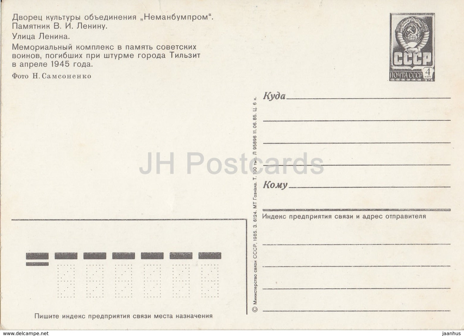 Sovetsk - Kaliningrad Oblast - region - monument to Lenin - tank - postal stationery - 1985 - Russia USSR - unused