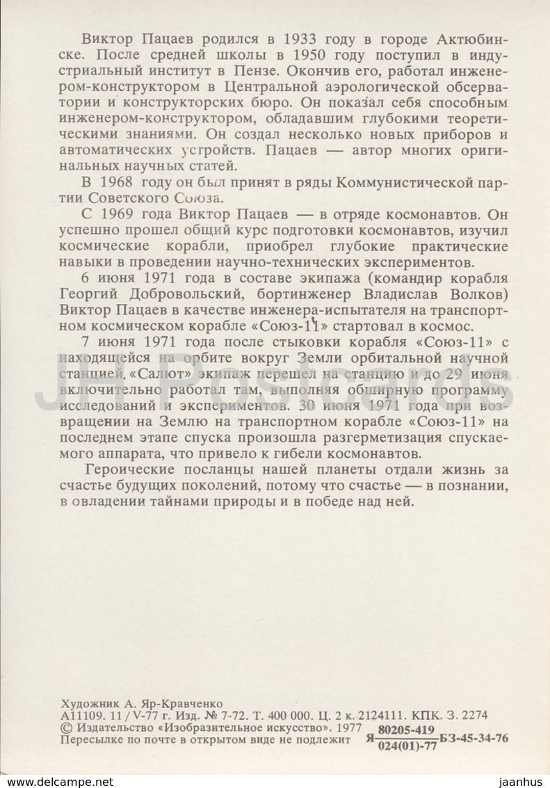 Soviet cosmonaut Viktor Patsayev - space - 1977 - Russia USSR - unused