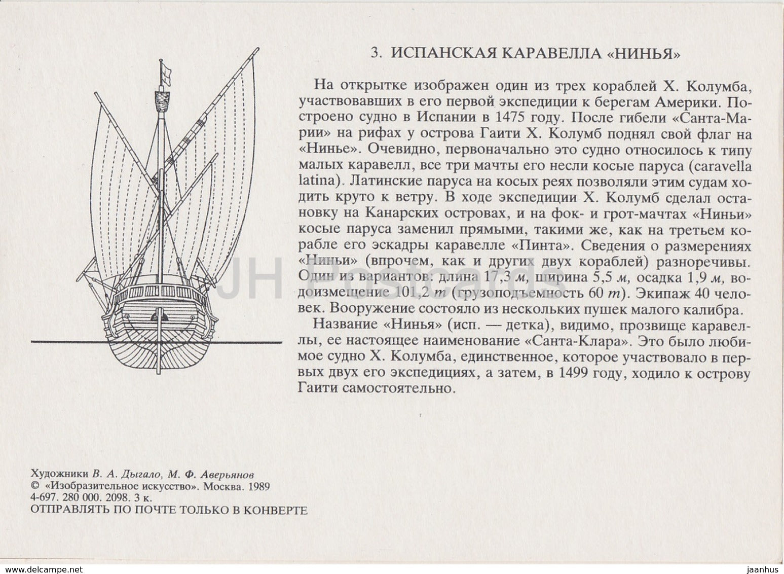 Spanish Caravel Nina - sailing ship - illustration - 1989 - Russia USSR - unused