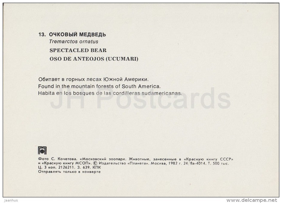 Spectacled bear - Tremarctos ornatus - Moscow Zoo - 1982 - Russia USSR - unused