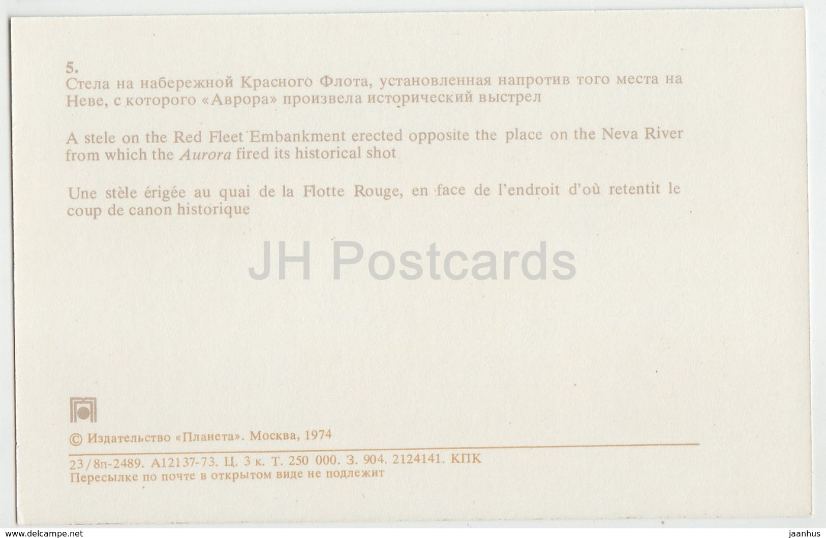 St Petersburg - Leningrad - Stele of the Red Fleet - cruiser Aurora - warship - 1974 - Russia USSR - unused