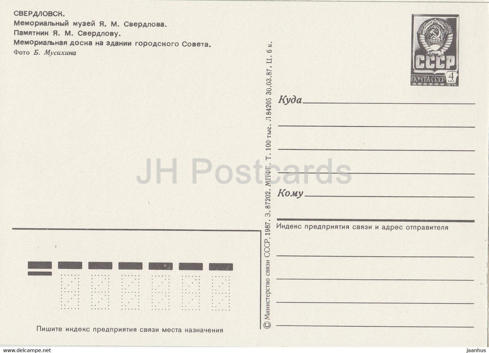 Sverdlovsk - Yekaterinburg - Sverdlov memorial museum - monument to Sverdlov - 1987 Russia USSR - unused
