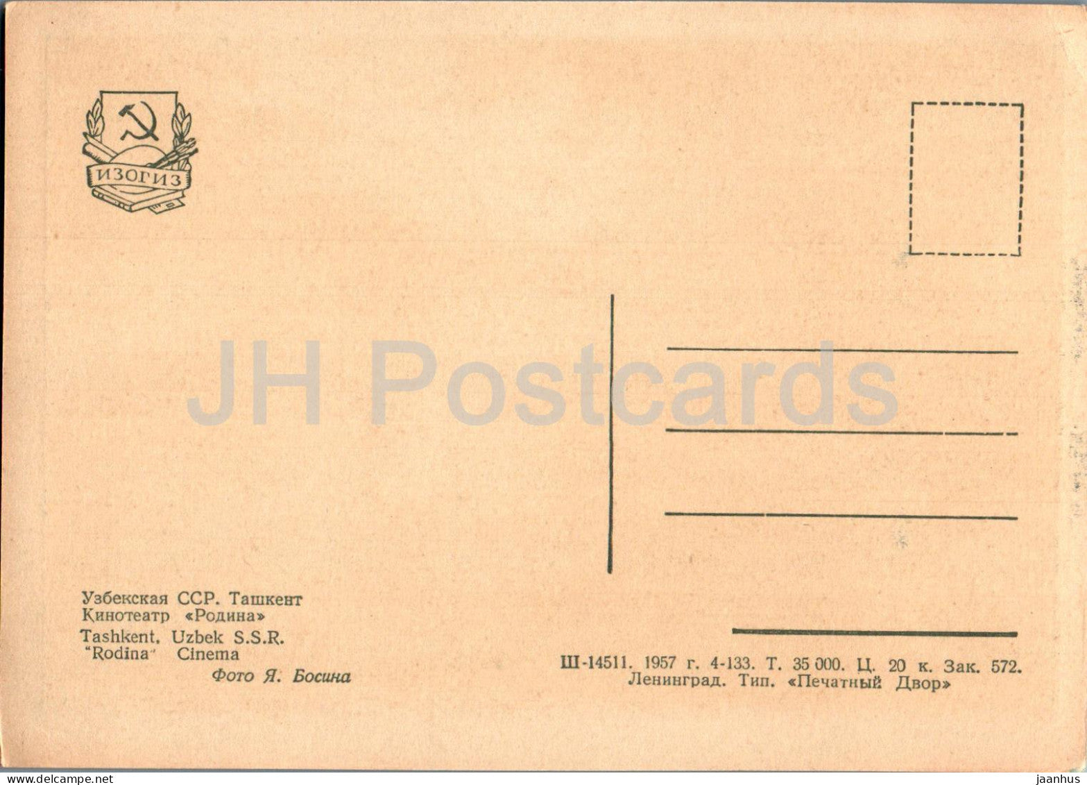 Tashkent - cinema Rodina - car ZIM - old postcard - 1957 - Uzbekistan USSR - unused